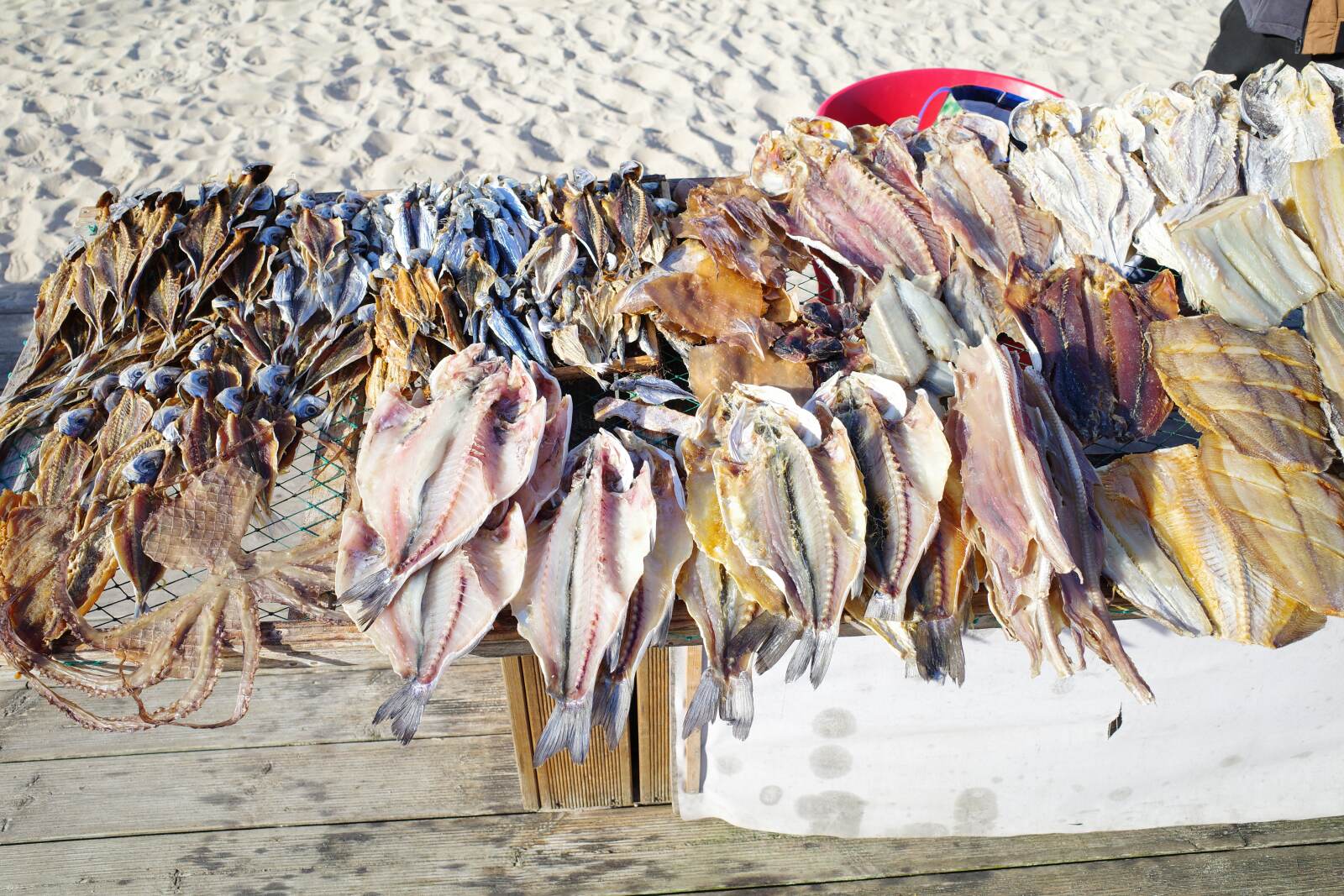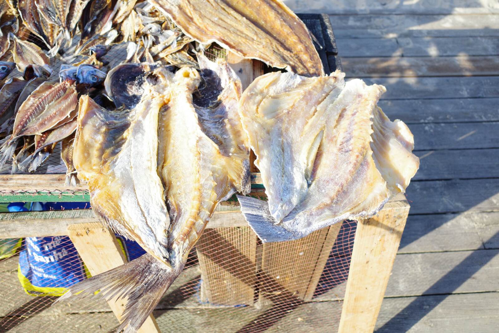 Es handelt sich bei den Fischen um Stockfisch, ein durch Lufttrocknung haltbar gemachter Fisch – vor allem Stöcker, Sardinen, Petermännchen, Dornhaie und Tintenfische werden für den Vorgang bevorzug genutzt.