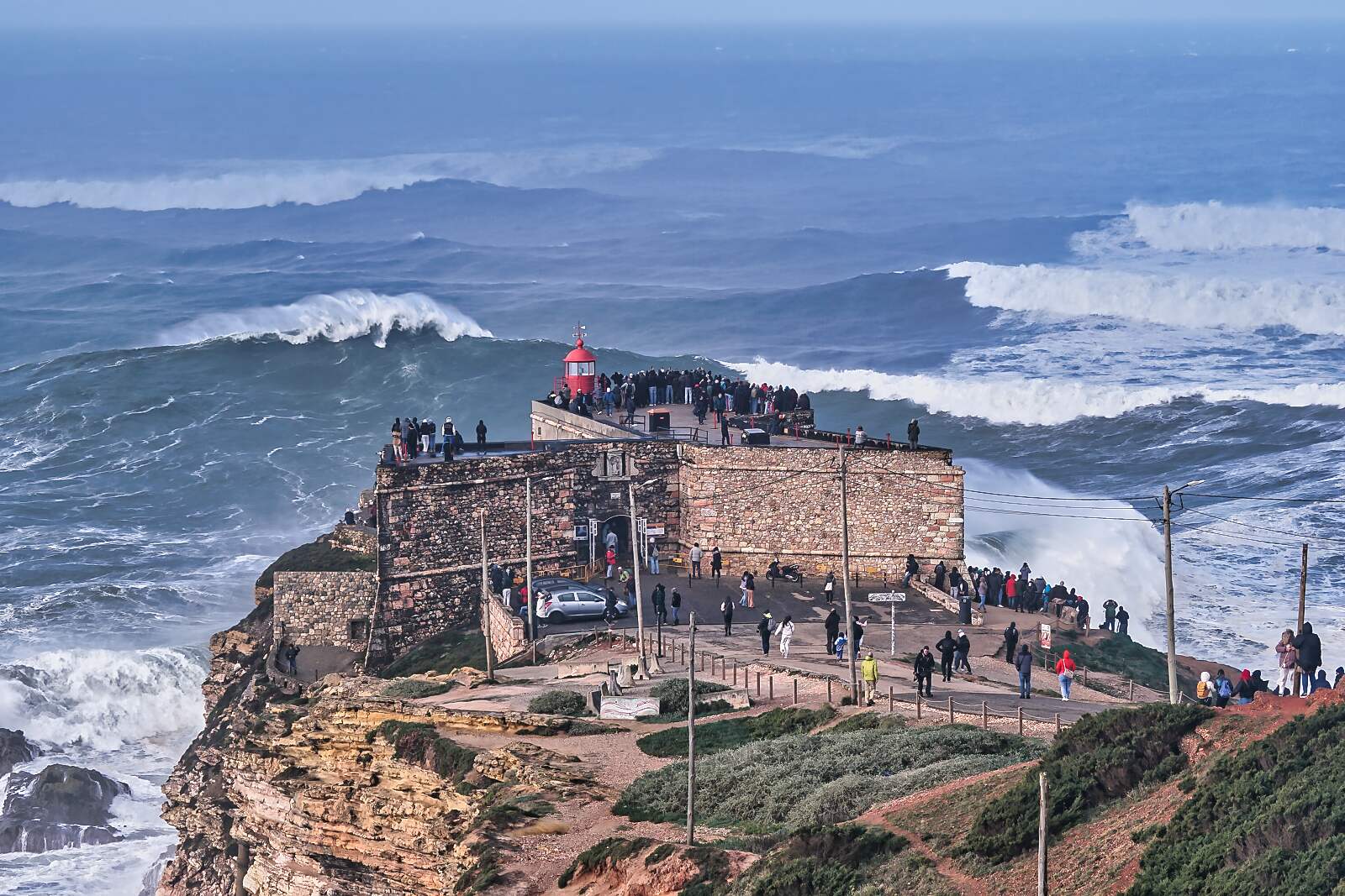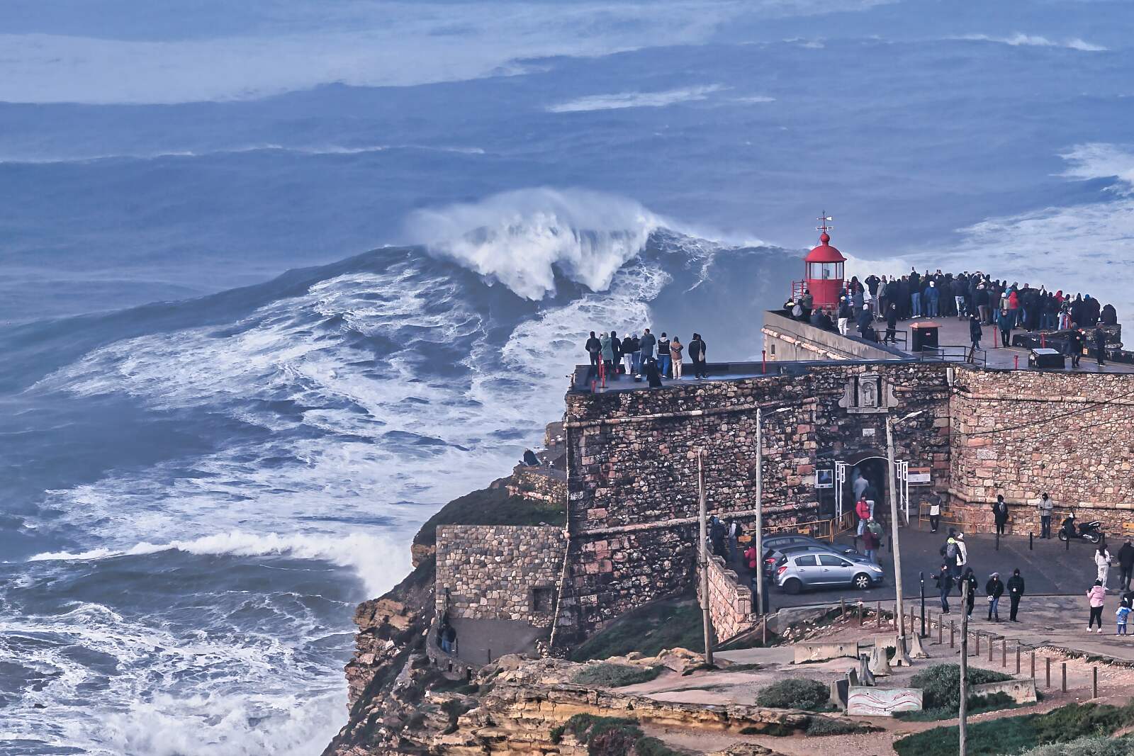 Zu Hunderten machen sich die Portugiesen und Schaulustige aus aller Welt, auf den Weg zum Leuchtturm bei Nazaré um die spektakulären Wellen zu sehen. Natürlich haben auch die Profisurfer Informationen über die lang ersehnte Ankunft der Riesenwellen erhalten, jetzt bieten sie ein Spektakel mit der Auseinandersetzung der unglaublichen Wellen.